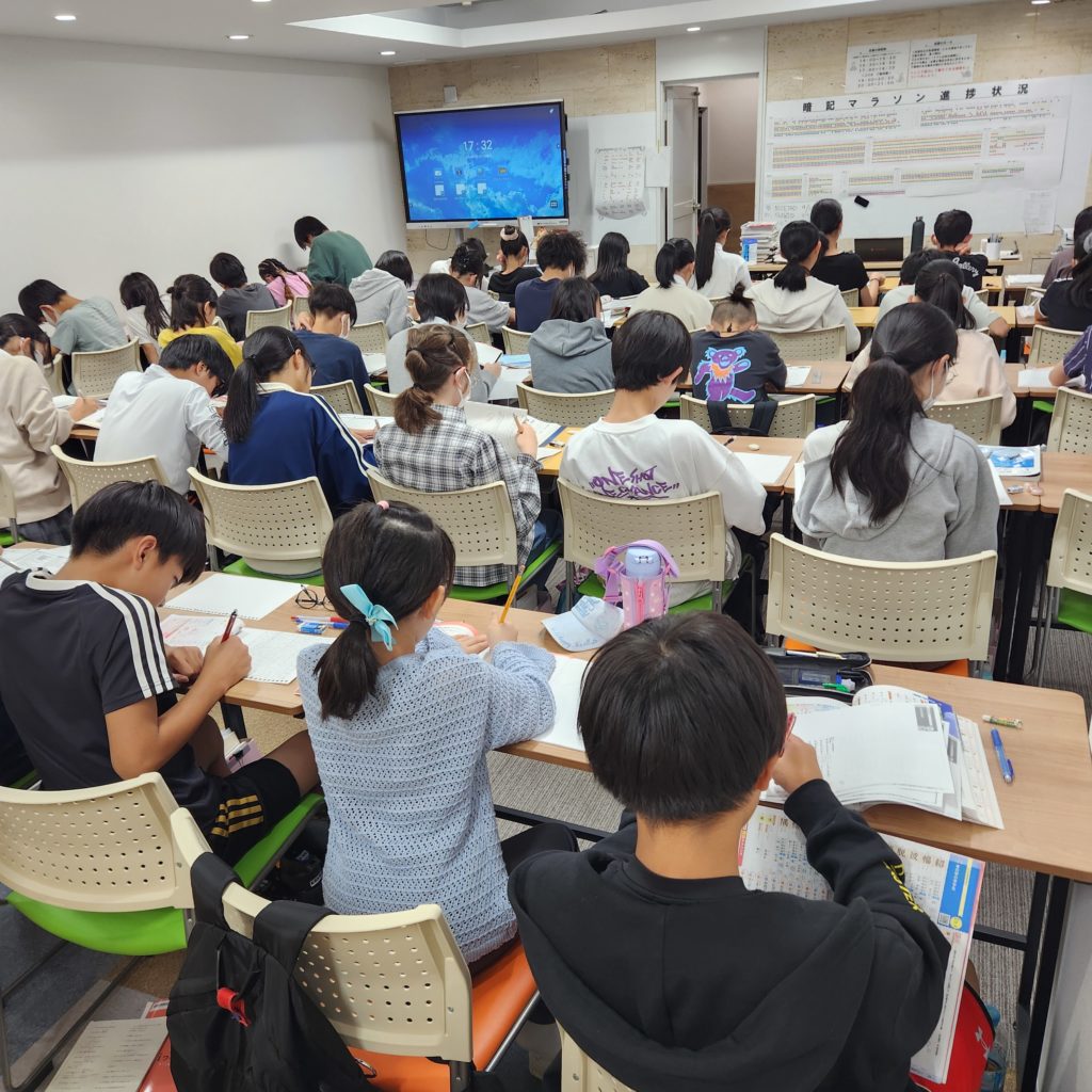 写真はテスト対策期間中の自習の様子です。中学生に混じって小学生も集中して自習を頑張ってくれています。(テスト対策期間中の小学生の授業は2階の教室にて行っています。)