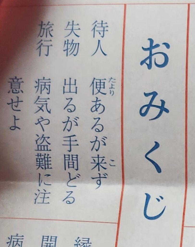 それにしてもボスのおみくじはなかなかに厳しいですね。待人「便りあるが来ず」って「期待させといて来ない」ってことですやん。じゃあ「待つな!」って書いてくれるとわかりやすいのに。